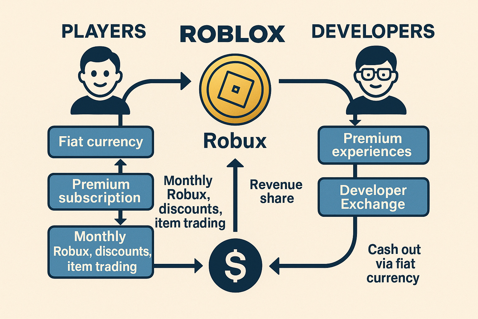 Like most two-sided platforms, Roblox serves both creators competing for user attention and users searching for the next hit experience. Its economy revolves around Robux, a premium currency that powers virtual item purchases and in-game transactions. Players can subscribe to Roblox Premium for a monthly Robux allowance, discounts, and access to advanced features like item trading. Developers monetize through revenue share from premium experience sales and a Developer Exchange that allows them to convert Robux into real-world income. The result is a closed-loop economy: fiat enters via player spending, circulates through platform-native systems, and exits through vetted creators with minimal leakage.