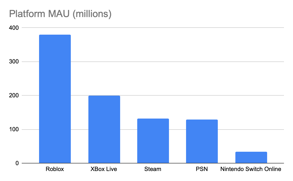 Roblox is the platform burgeoning creators go to dip their toes in the game development waters. Roblox has retained all creators below the indie game level production because they are the only platform where significant revenue is generated for that level of game. Creators also retain because Roblox has cornered the younger video game demographic, having higher MAU than Nintendo. Having the healthiest creator resource allows Roblox to update their art, supported devices, and technology to keep ahead of competitors. This all cultivated with Roblox’s massive warchest through its fundraising ability and the largest IPO in video game history.