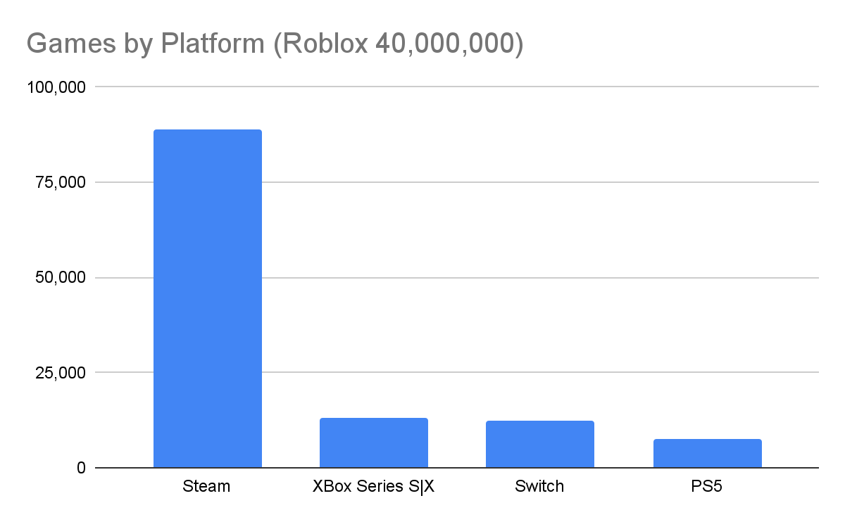 Roblox’s creator output thrives because the tool suite, Roblox Studio, and the asset store, Creator Store, lower the barrier to entry so low that children can build, test and publish games with no code and no funding. Such a low barrier to entry begets volume, an estimated 40 million games of volume (compared to an estimated 89k on Steam). Such a massive volume begets hit games, top Roblox games record over 10 billion visits. With hit games begets more developers pushing quality, top Roblox developers earn over $20 million annually. And so the flywheel spins.