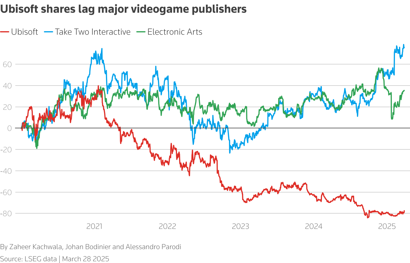 The market reaction was immediate and sharp. Ubisoft shares dropped 15% the day after the spinout was announced and nearly 40% over the next 10 days.