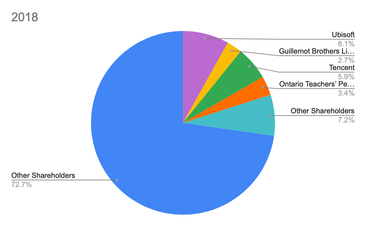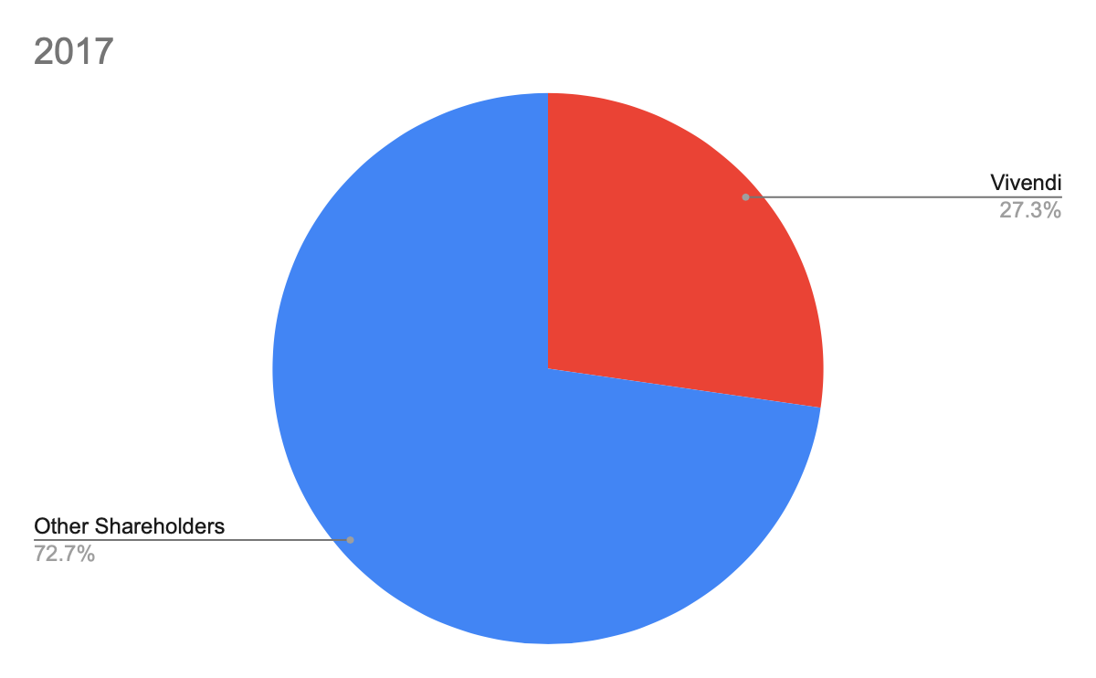 2015–2018: French media giant Vivendi acquires 27.3% of Ubisoft over three years, nearing the 30% threshold that would trigger a mandatory buyout offer under French law. Ubisoft fights back. In 2018, Vivendi backs down and sells to a group of “white knight” investors: