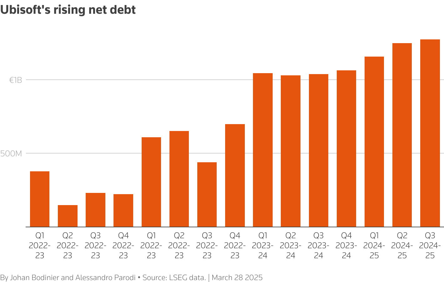 Tencent’s price implies a $5 billion enterprise value, meaning roughly $620 million of the new entity’s capital structure will be made up of debt or preferred equity. In effect, the new subsidiary is taking on more than 50% of Ubisoft’s $1.1 billion outstanding debt, a strategic move that delivers needed relief to both companies. Ubisoft’s net debt doubled between 2022 and 2023.