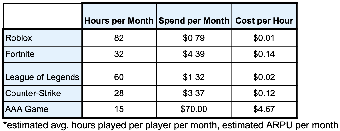 Taking the roughest of estimates you can see the value proposition facing gamers today. Buying a $70 AAA game to play roughly 15 hours before quitting is an incredibly expensive cost per hour of engagement compared to the dominant games. It’s easy to see why Roblox is the preferred option for the under 16 gamers, you have over 40 million experiences to play and effectively pay nothing for playing them.