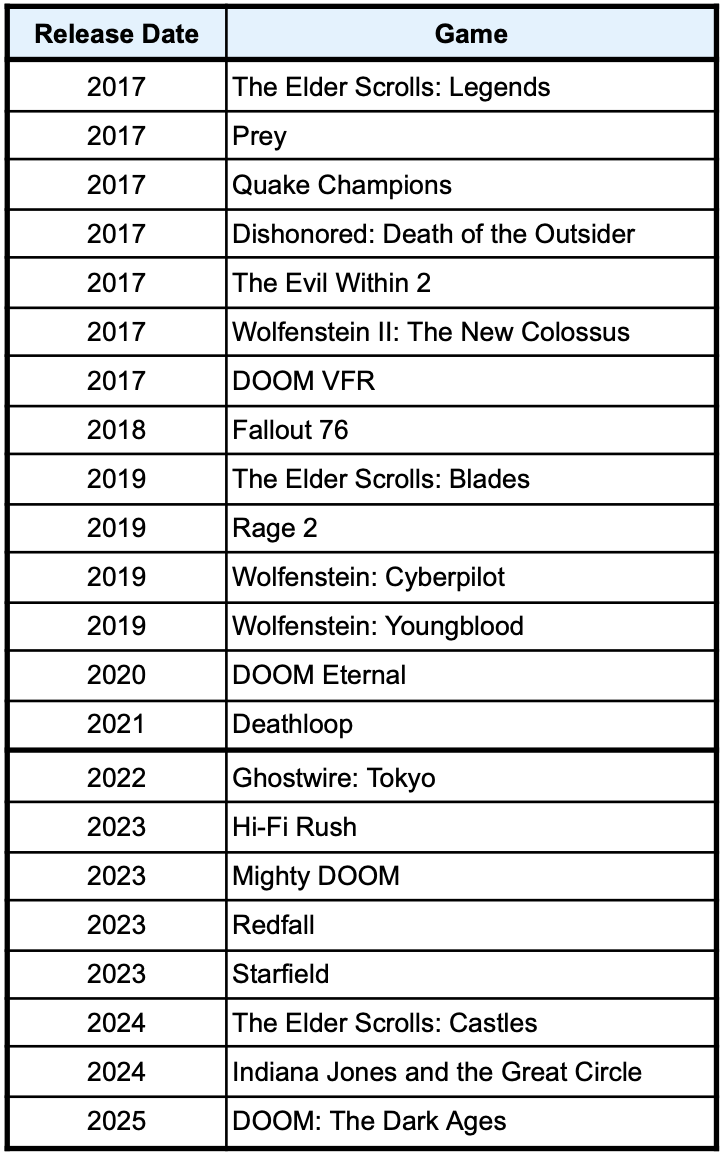 A great question to ask is whether the game studios and consumers are worse off with Microsoft owning these studios. Although Microsoft has a questionable legacy of managing acquired studios (Ensemble, Lionhead), the best candidate to answer this question is none other than RPG heavy hitter Bethesda. Created in 1986, acquired by Microsoft in 2021, Bethesda is a publishing juggernaut known for the Elder Scrolls, Fallout, and Doom series. Bethesda gives us a good post-acquisition runway to compare to the legacy independent publisher performance.